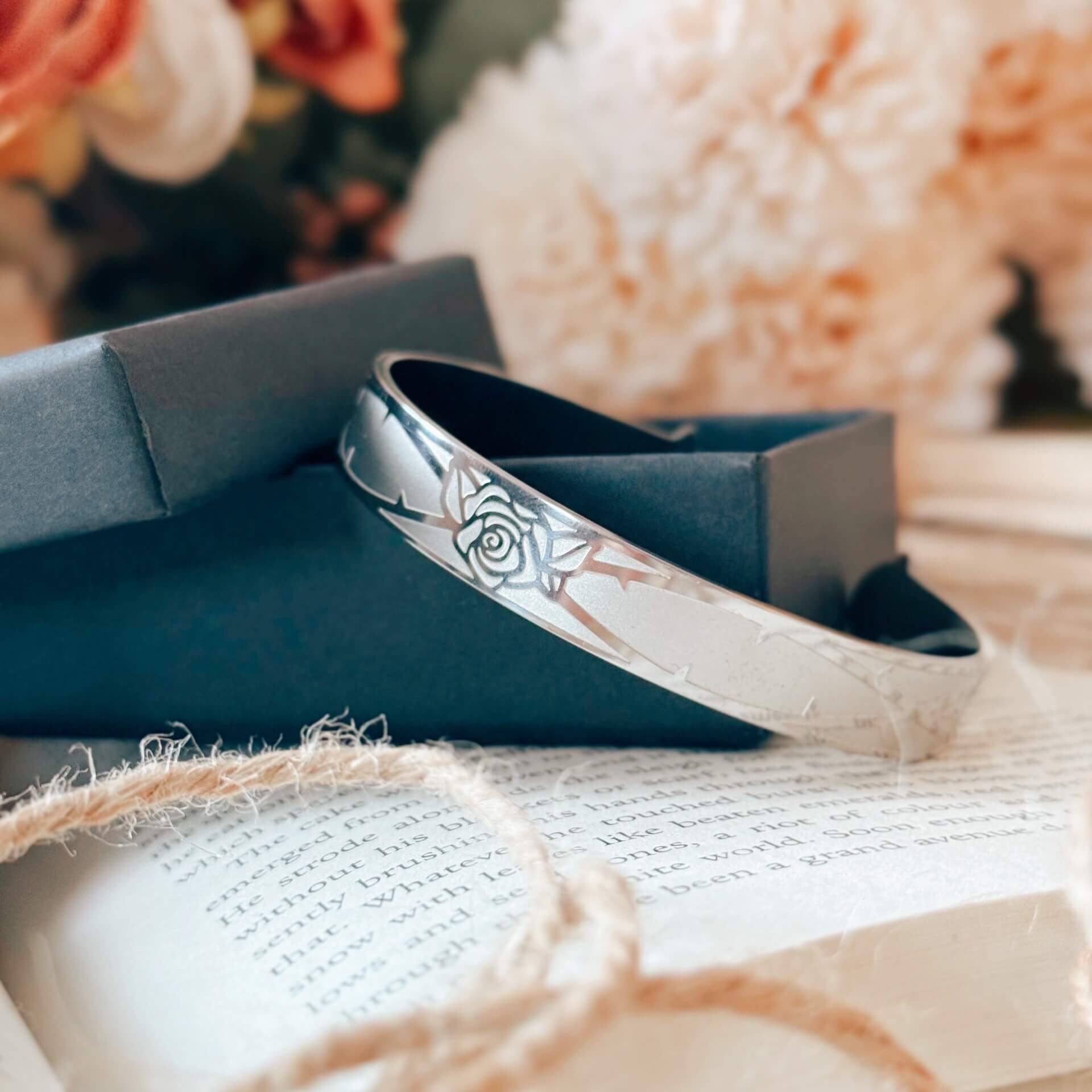 Who says fashion and fantasy can’t intertwine? Our Heartless Hunter-inspired bracelet is the perfect accessory to go with any outfit! This bracelet with its beautiful rose motif was designed by @apollosproblemchild.