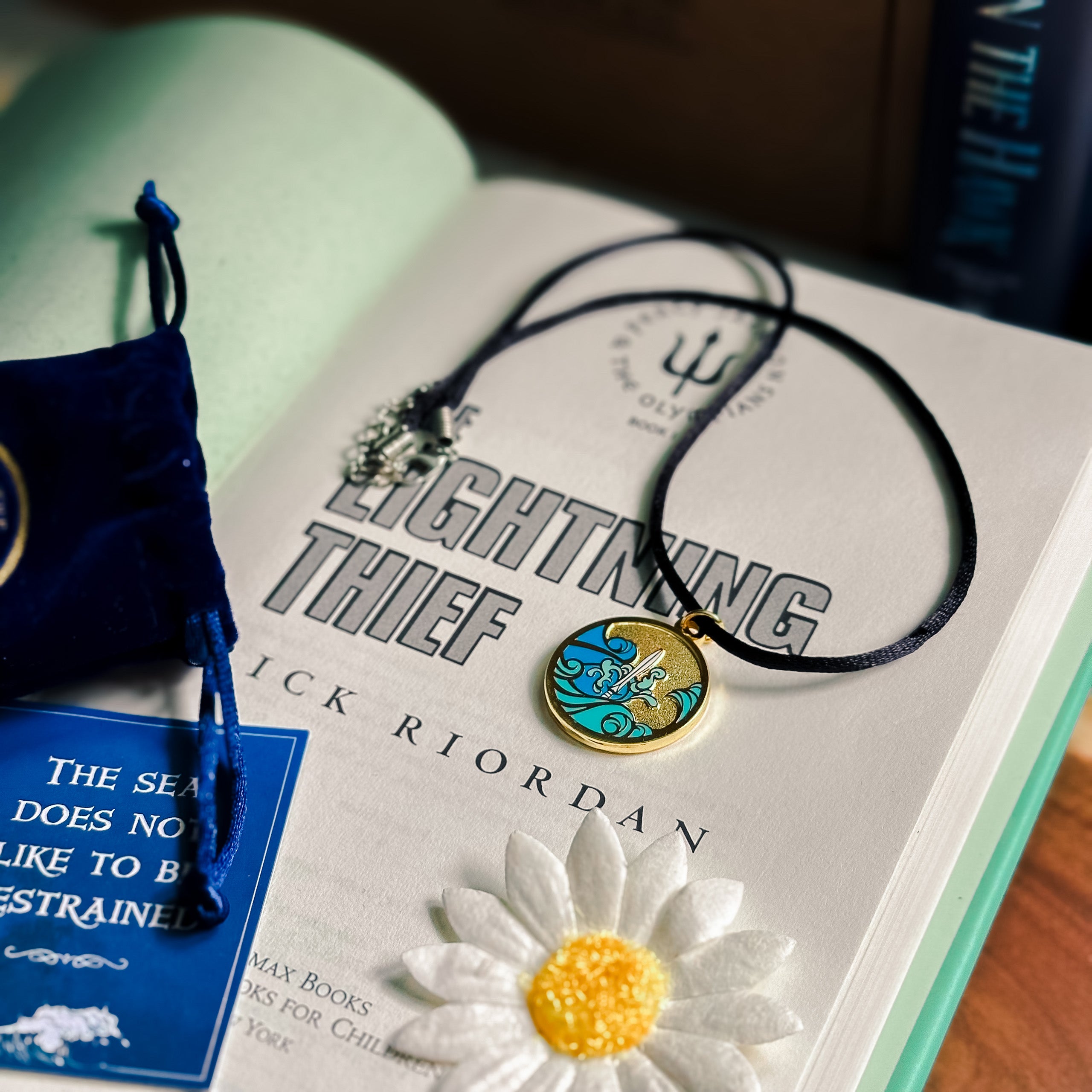 Inspired by Percy Jackson and the Olympians, your enamel pendant features iconic designs representing both Percy and Annabeth. Designed by @keelystudios, this is the perfect item to wear as you enter Camp Half-Blood!