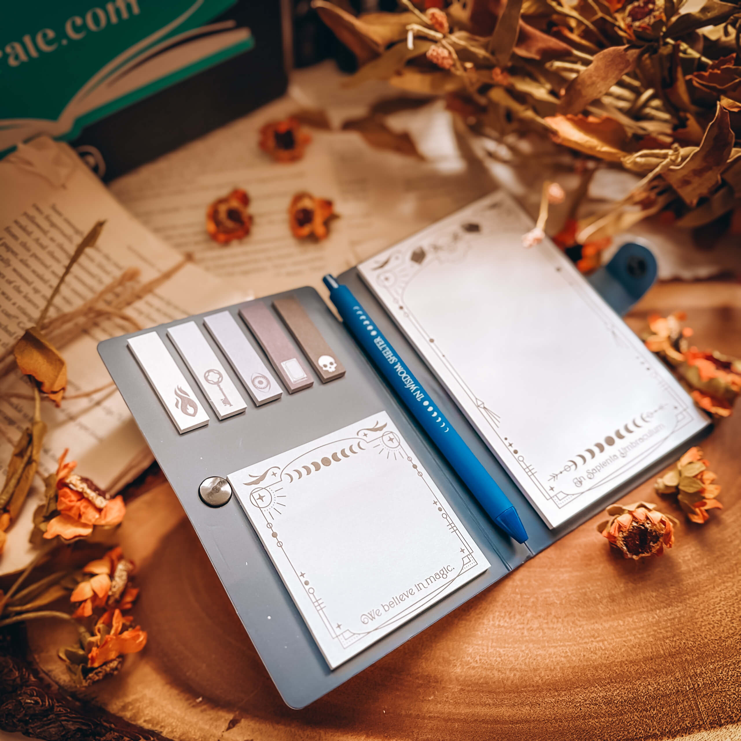 For the readers who love to tab, annotate, and take notes, this next item is a gold mine! Our reading kit features several designed tabs, post-its, a notepad, and a pen. Inspired by the Scholomance series and beautifully made by Gretchen Cobaugh (@lichen_and_limestone).