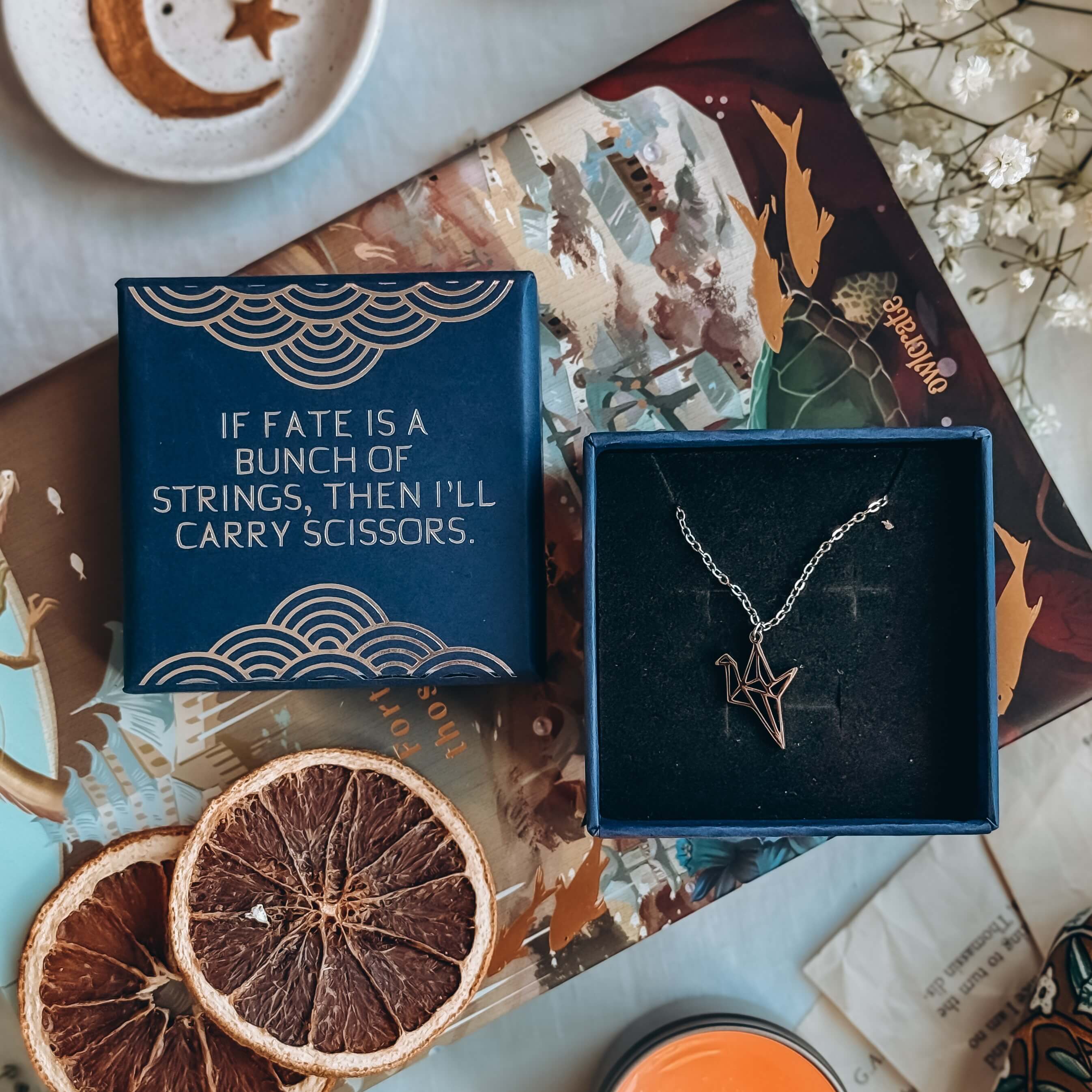 It's the season of stylish accessories, and this necklace with a paper crane motif is the perfect item to wear as a little fashionable companion! The delicate design is inspired by Six Crimson Cranes and was beautifully made by the Readers Society Shop!