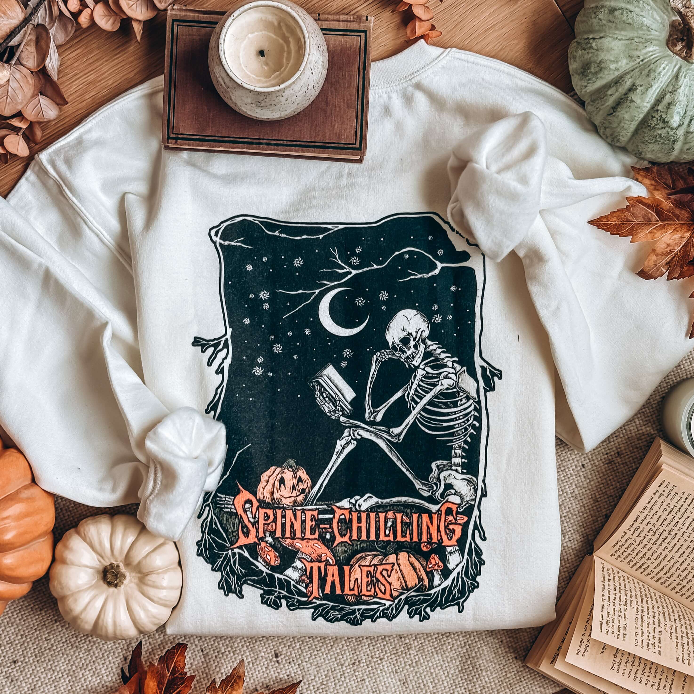 Rattle some bones with this Spine-Chilling Tales Skeleton sweatshirt, designed by @emilyvarts and lettering by Hey Atlas Creative.