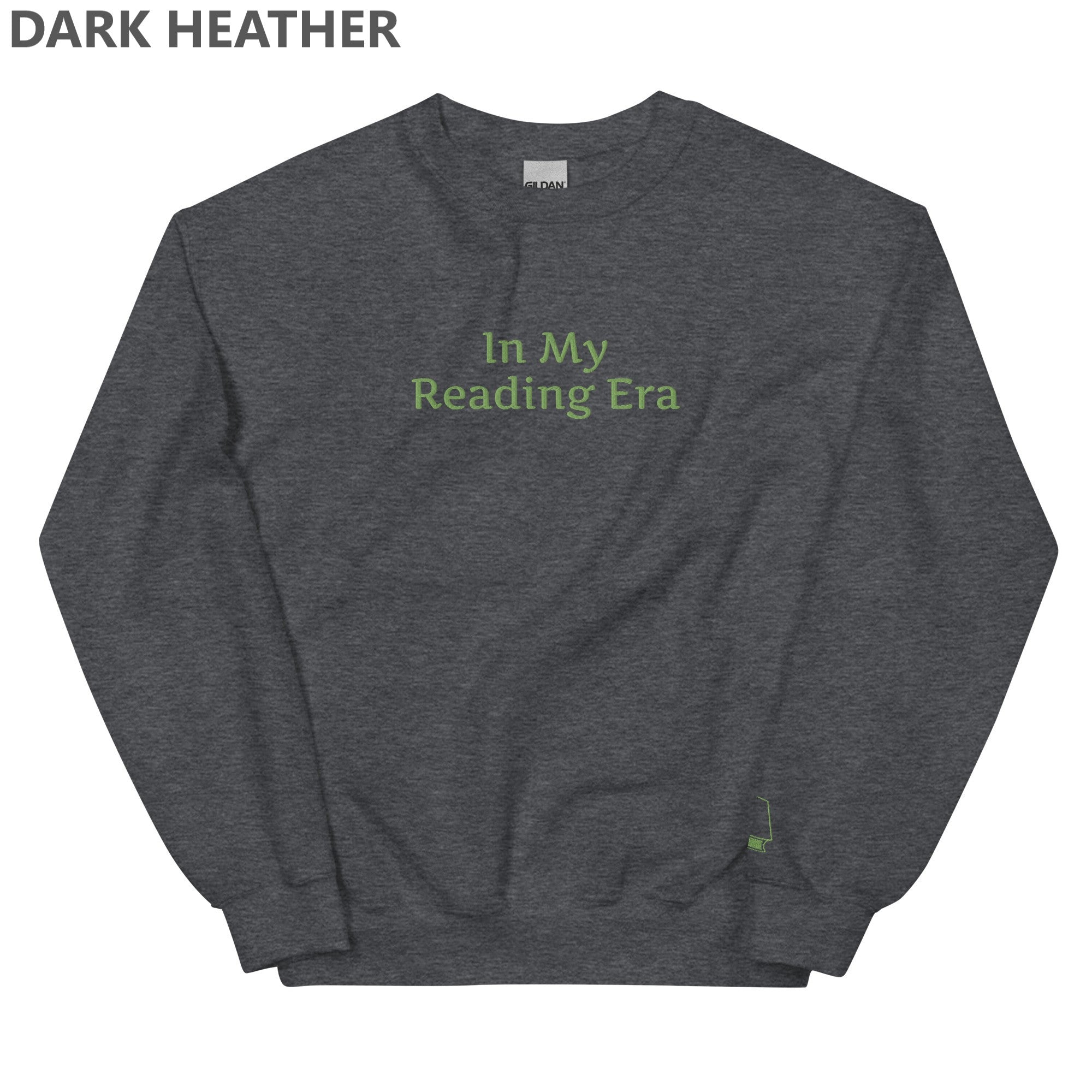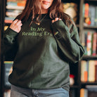 Show off your inner book owl with our embroidered “In My Reading Era” sweatshirt, available in either dark heather or forest green with light green embroidery.