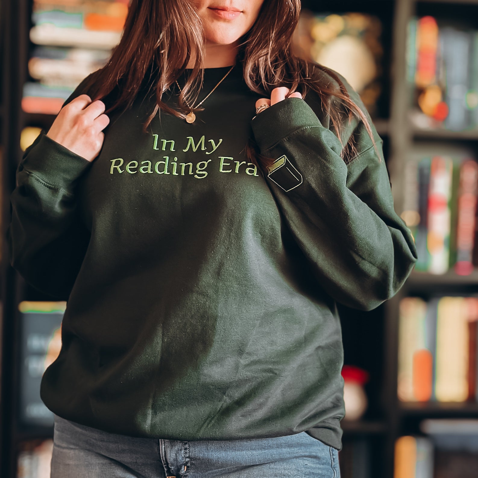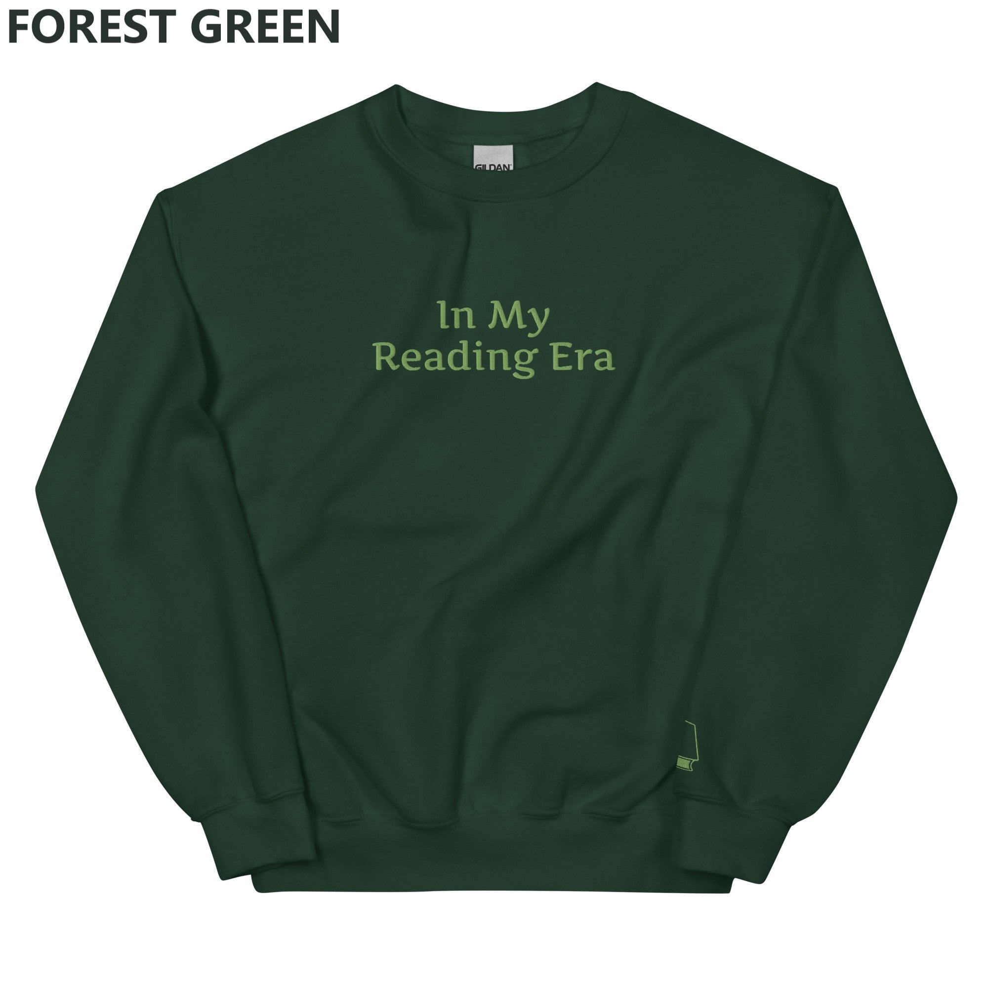 Show off your inner book owl with our embroidered “In My Reading Era” sweatshirt, available in either dark heather or forest green with light green embroidery.