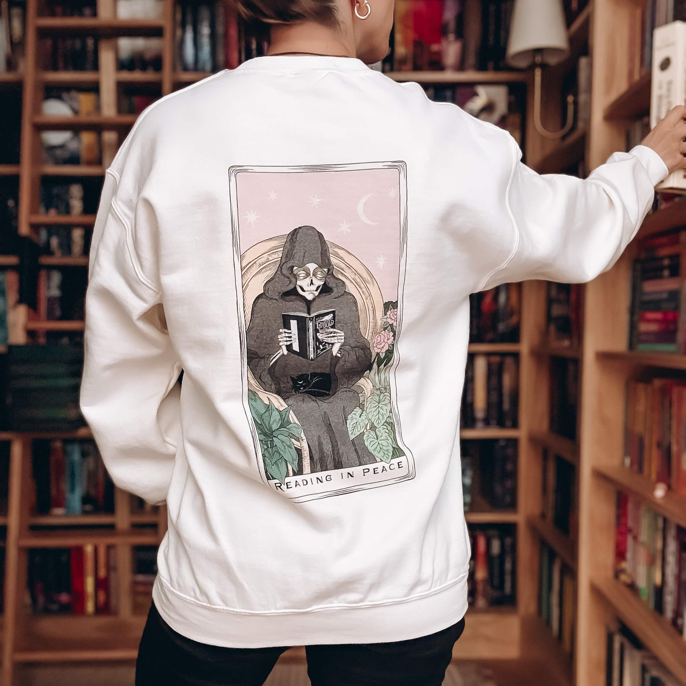 Embrace sweet oblivion with your Reading in Peace Death sweatshirt, designed by @l0ll3_ and lettering by Hey Atlas Creative.